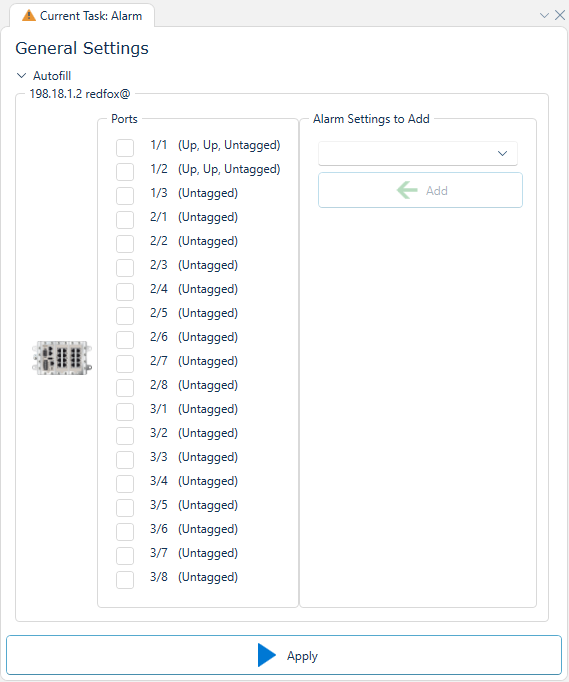Depicted above is the user interface of this task, where we can see a list of devices, in this case a singular one, each containing a list of ports and a template selector called "Alarm Settings to Add". Above the device list exists an autofill section that is handy for rapidly configuring many devices.