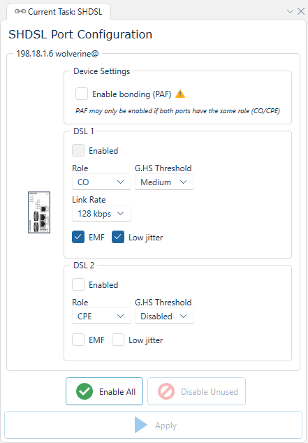For each port, select Role (CO/CPE). When applicable, select G.HS threshold, link rate, EMF (emergency freeze), noise margin and low jitter. It will also be possible to select Pass. When applicable, it will be possible to select PAF (SHDSL bonding).