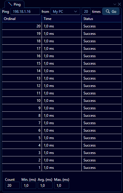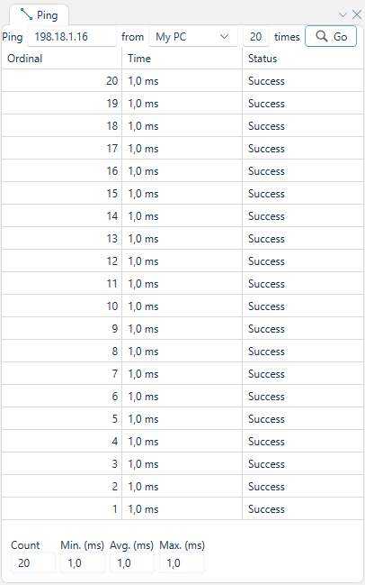 The results will then be displayed in a table, as depicted in the example above, contain the ordinal, roundtrip time and status for each ping in the sequence.